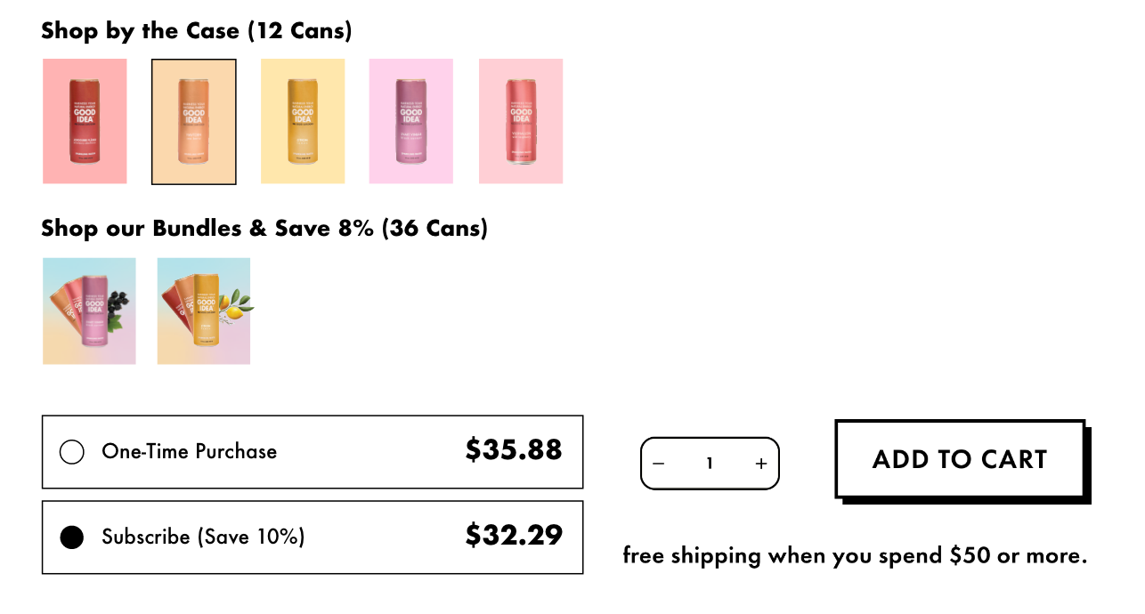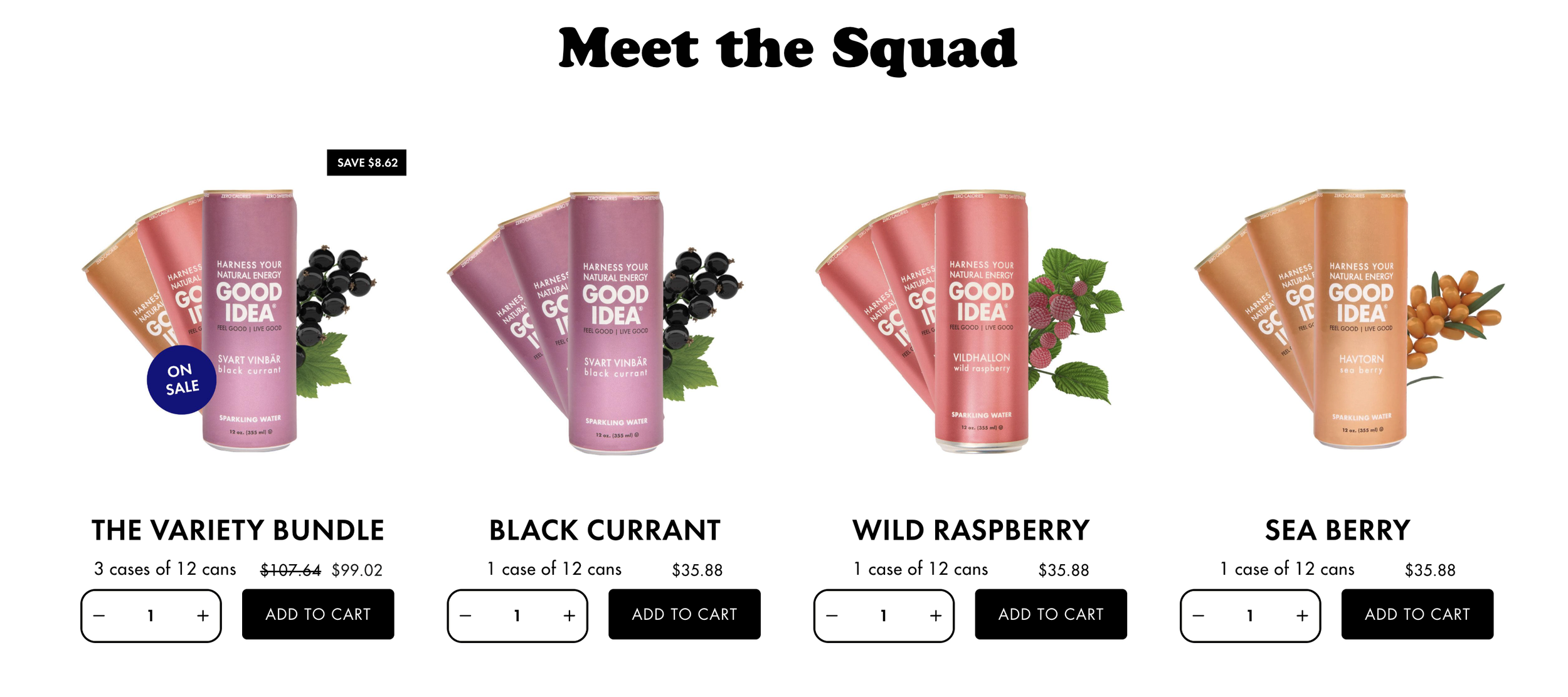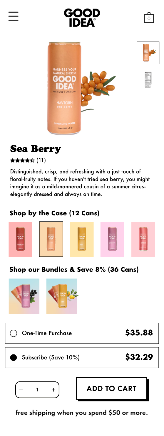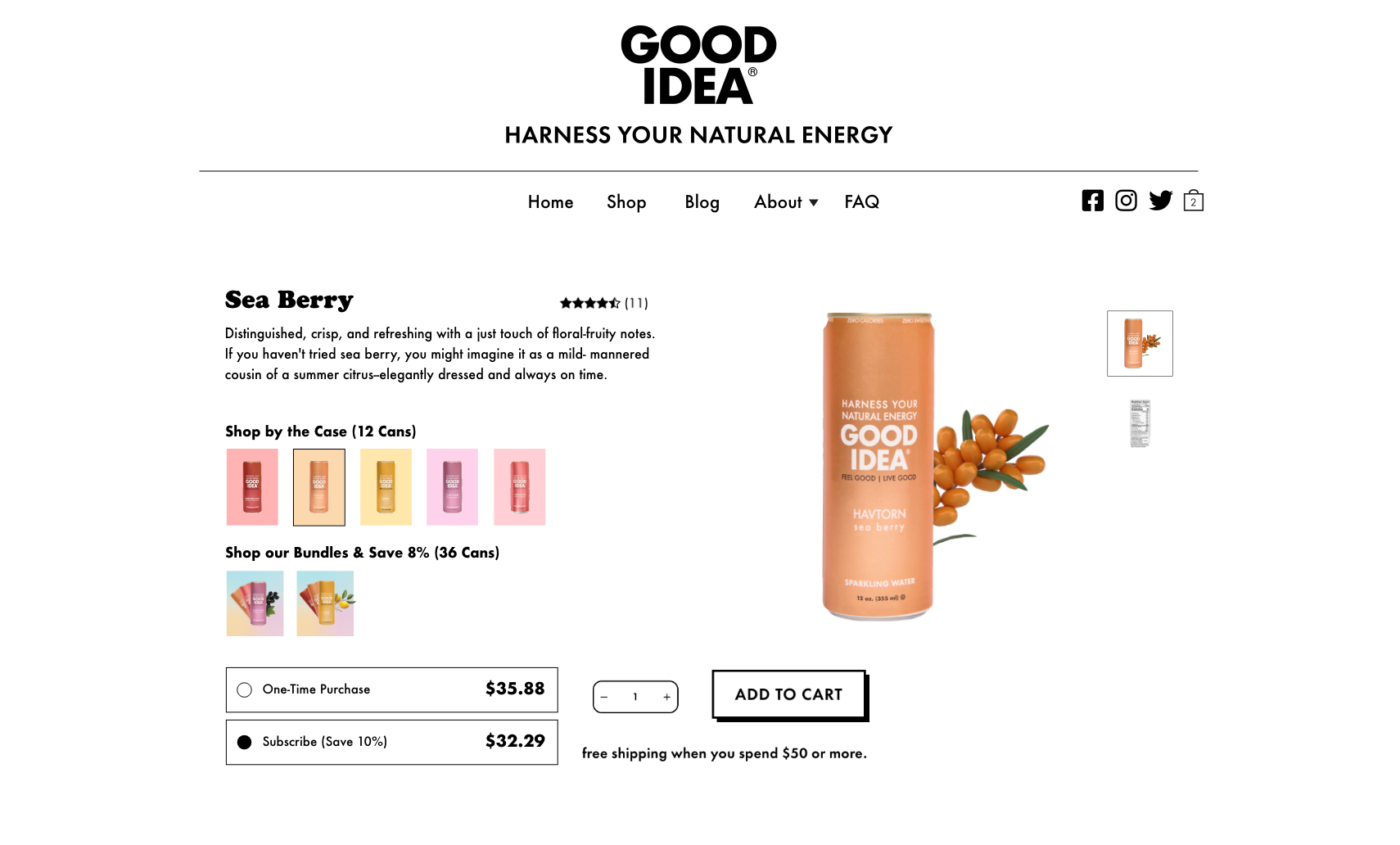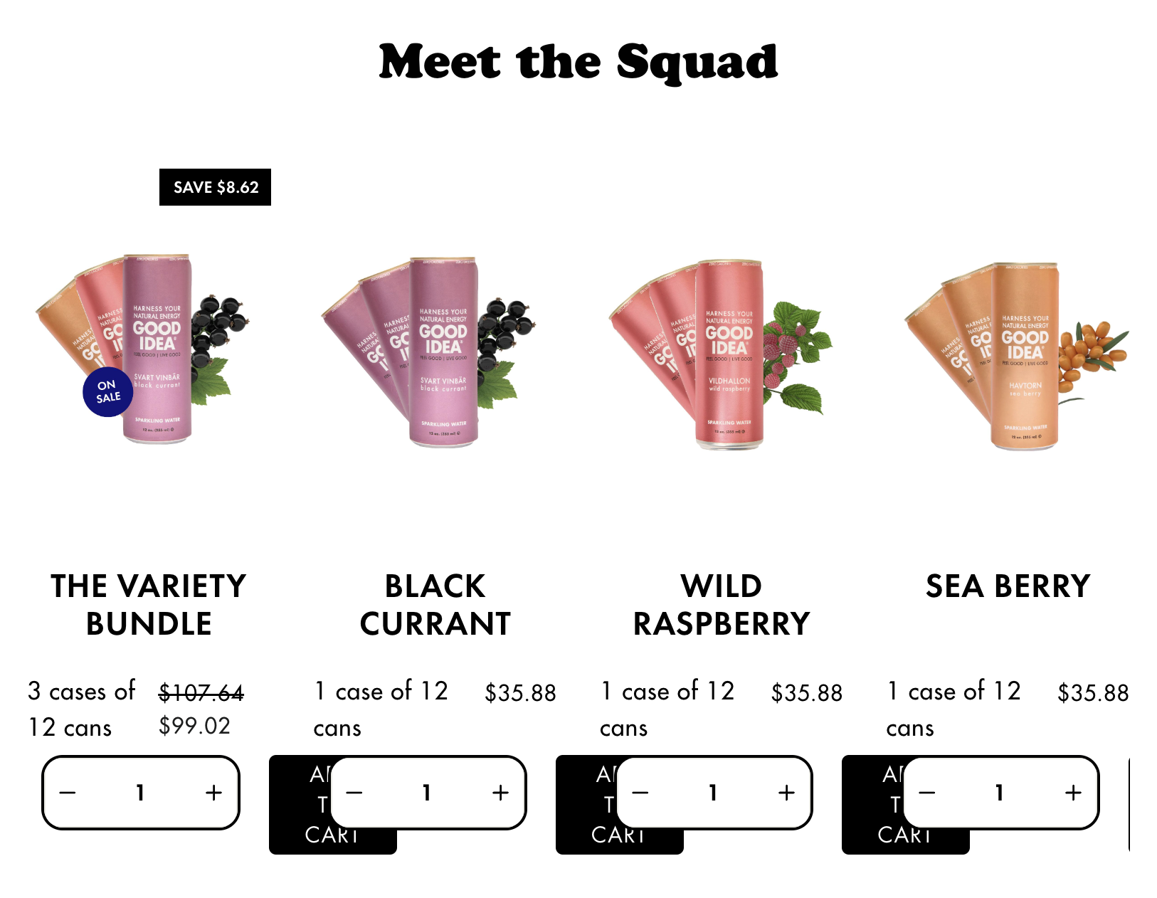 The most common task a user will do on the GOOD IDEA website is to buy our sparkling water, so this will need to be the smoothest user experience! When adding a wild raspberry flavored 12-pack, it seems hard to follow with the reviews on the left side of the radio buttons of one time purchase and subscriptions. All UI elements seemed a bit clustered together as well; some spacing would help here. Visual hierarchy would be of good use as well: