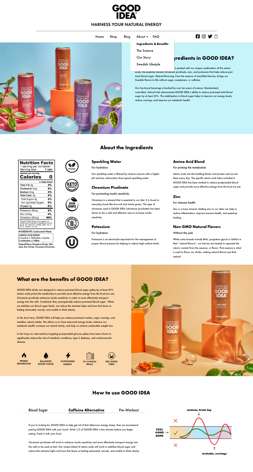 Common complaints about our website was the user requesting what are the ingredients in GOOD IDEA! As we provide in all our email campaigns and right on the actual product page, user still felt confused where to find more information about what the sparkling water holds. This resulted in creating a whole separate page in the top navigation. Still keeping the user engaged and all information in place, created layout, imagery, interactive ‘How to Use’ tabs and more!